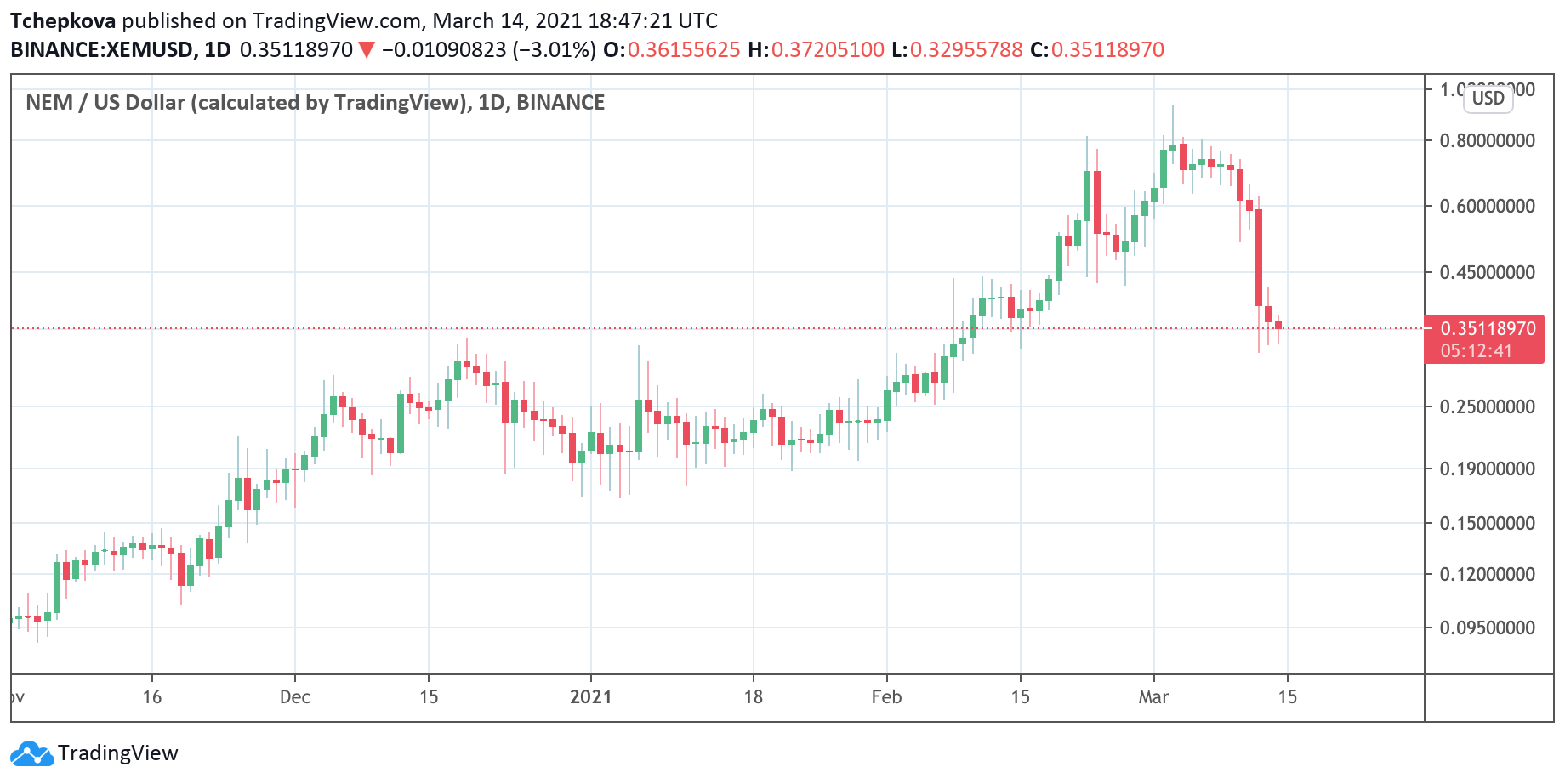 В начале марта цена XEM быстро росла в ожидании эйрдропа и обновления системы NIS1. Однако после снимка токен рухнул. На момент написания материала XEM/USD торгуется на уровне $0,35.