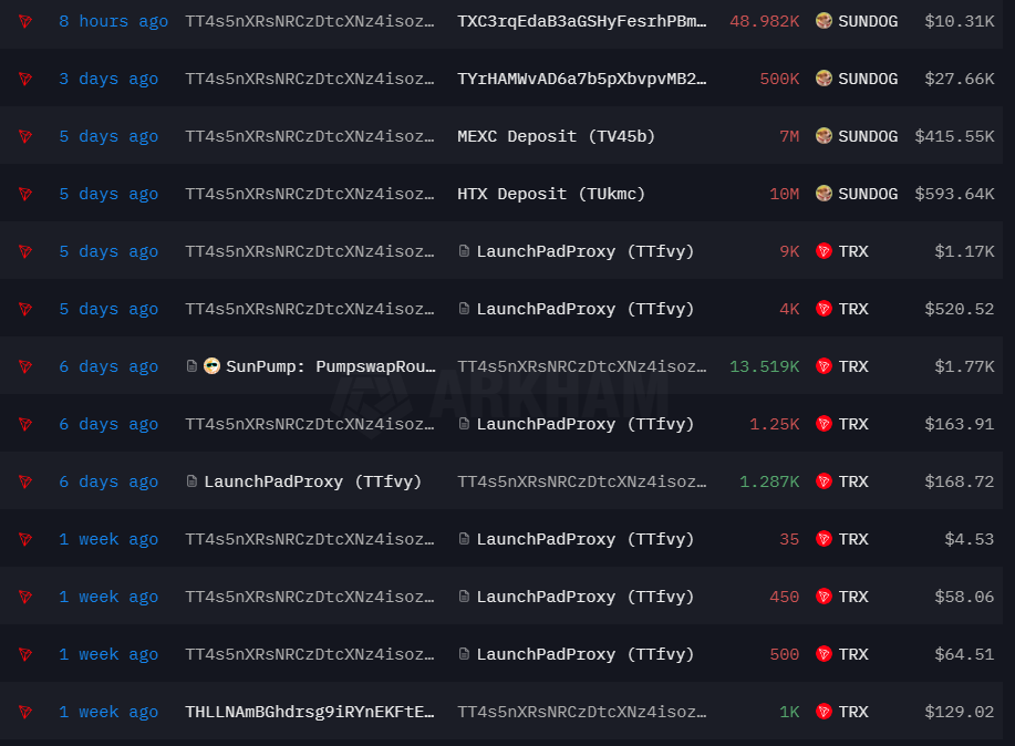Речь идет о владельце кошелька TT4s5nXRsNRCzDtcXNz4isoz5GgGYgDLkk. Команда Arkham обратила внимание на то, что ему потребовалось меньше недели, чтобы заработать $20 млн на монете SUNDOG при первоначальных инвестициях, которые немногим превышали $1500.