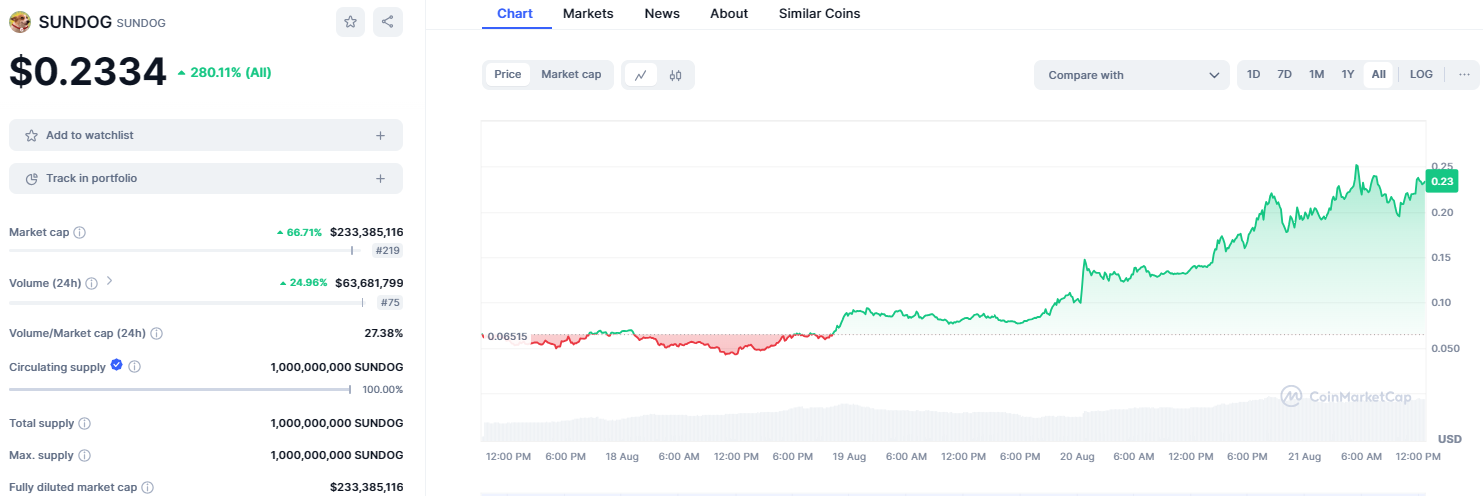 Спустя несколько дней после запуска торгов SUNDOG вплотную приблизилась к топ-200 капитализации. По состоянию на момент написания обзора, криптовалюта торгуется по $0,2334.