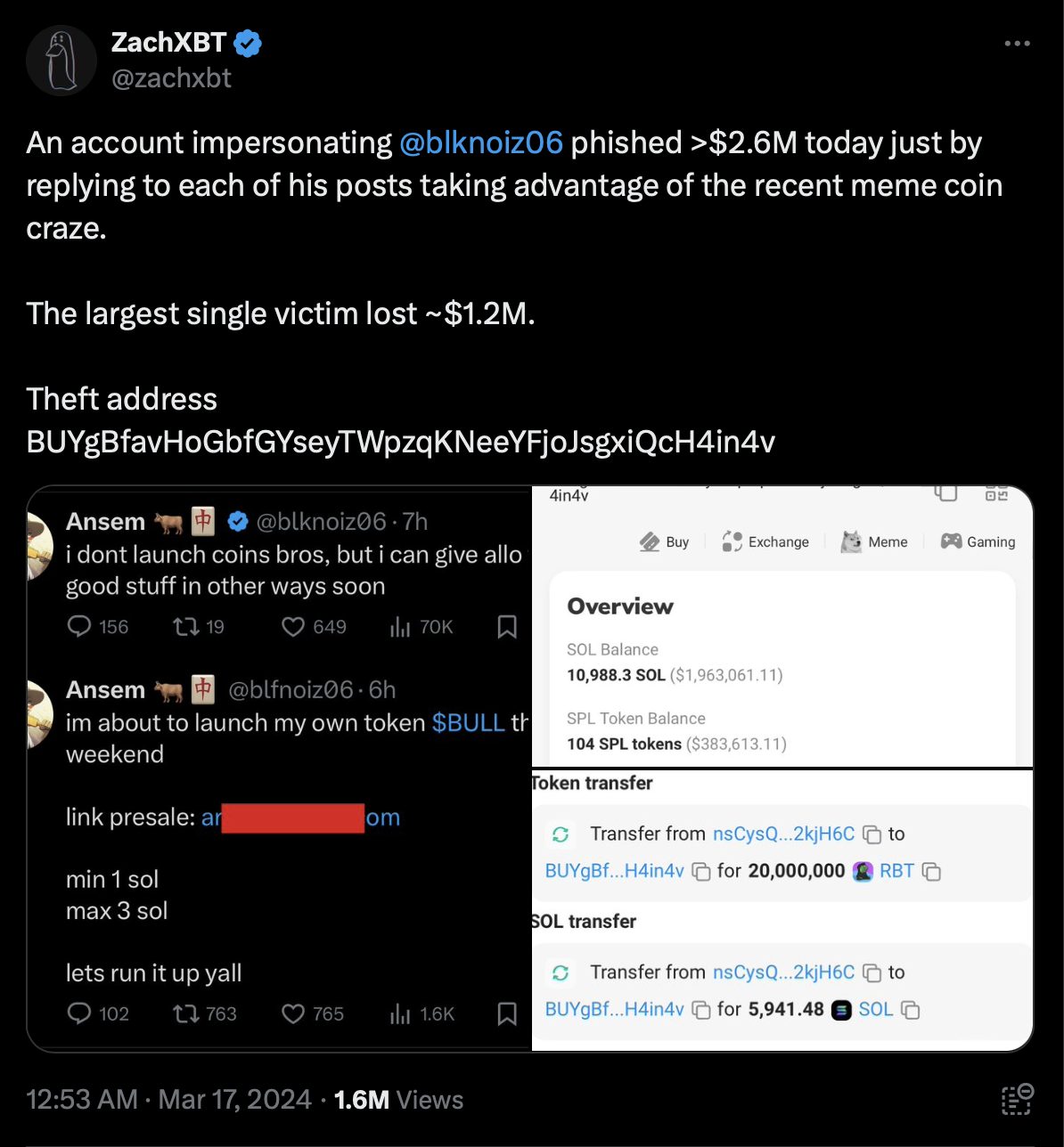 По словам ZachXBT, злоумышленник создал клон аккаунта Ansem, изменив одну букву в юзернейме, и отправлял ссылку на фейковый пресейл мемкоина на Solana под названием BULL в комментариях к его постам. Пользователи переходили по адресу и подключались к сайту, после чего дрейнер опустошал их кошельки. Самый крупный ущерб составил около $1,2 млн.