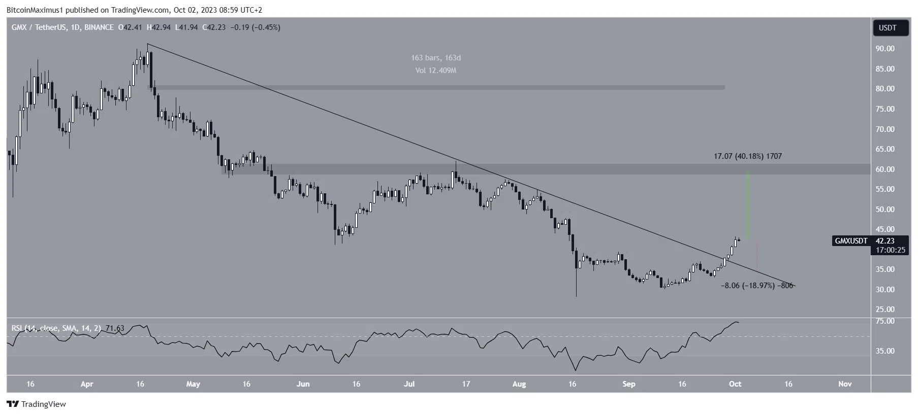 Цена GMX начала расти после достижения минимума в $28,16 17 августа. В начале сентября цена сформировала более высокий минимум, а затем прорвалась выше нисходящей линии сопротивления, которая существовала 163 дня.