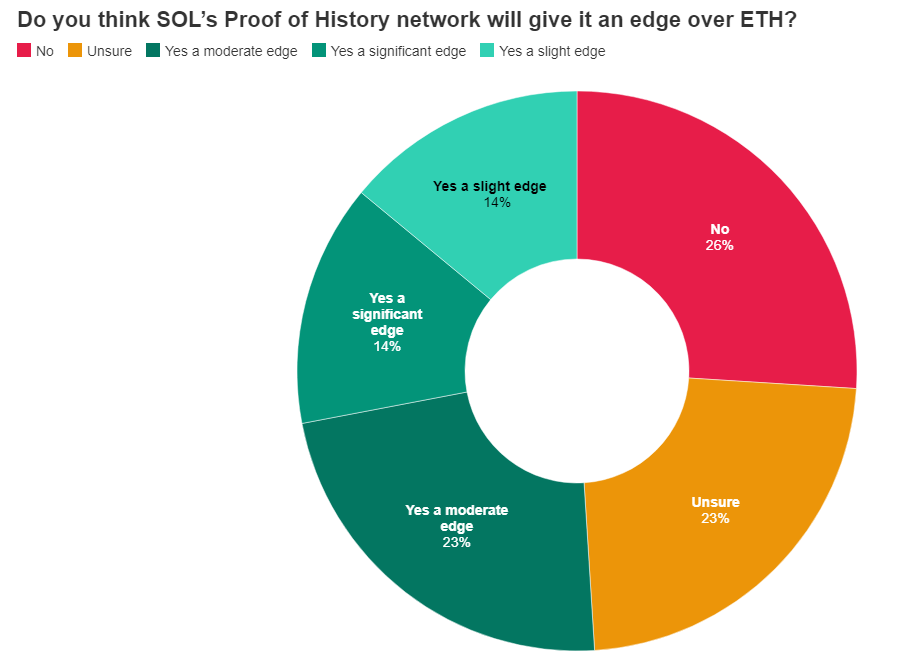 При этом оба сомневаются, что до конца 2021 года SOL будет стоить больше $250. Как выяснили в Finder.com, 51% респондентов считают, что алгоритм сети, построенный на базе консенсуса Proof of Stake и Proof of History, даст Solana преимущество перед Ethereum.