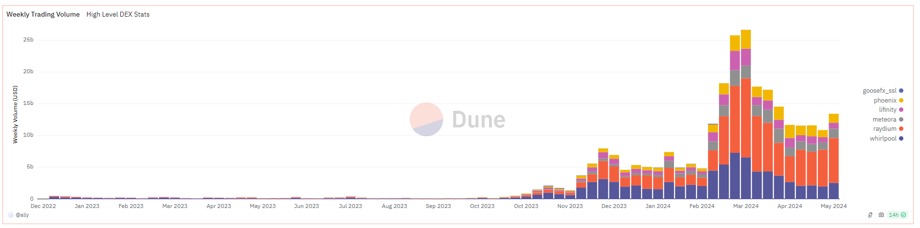 Ключевым игроков во всей этой истории стала Raydium — ведущая децентрализованная биржа на Solana. Средний еженедельный объем торгов на этой площадке составил около $5 млн.