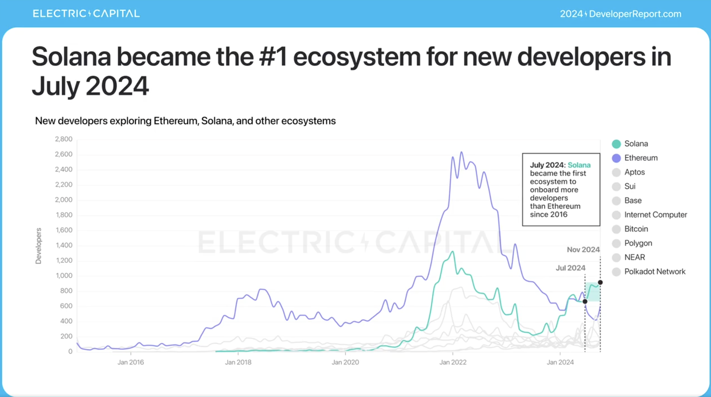 Согласно отчету Electric Capital, в 2024 году Solana привлекла 7 625 новых разработчиков, в то время как Ethereum — 6 456.