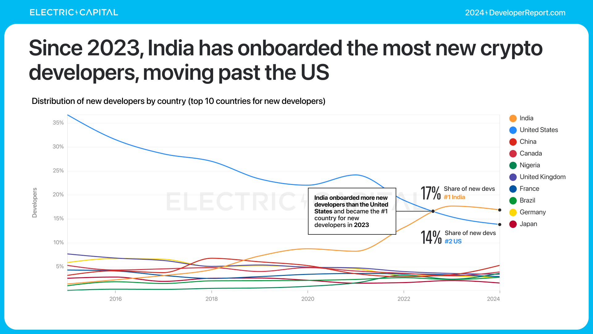 В Азии появляется все больше специалистов, задействованных в блокчейне. В частности, их число растет в Индии. Так, по данным Electric Capital, каждый третий разработчик живет в одной из азиатских стран.