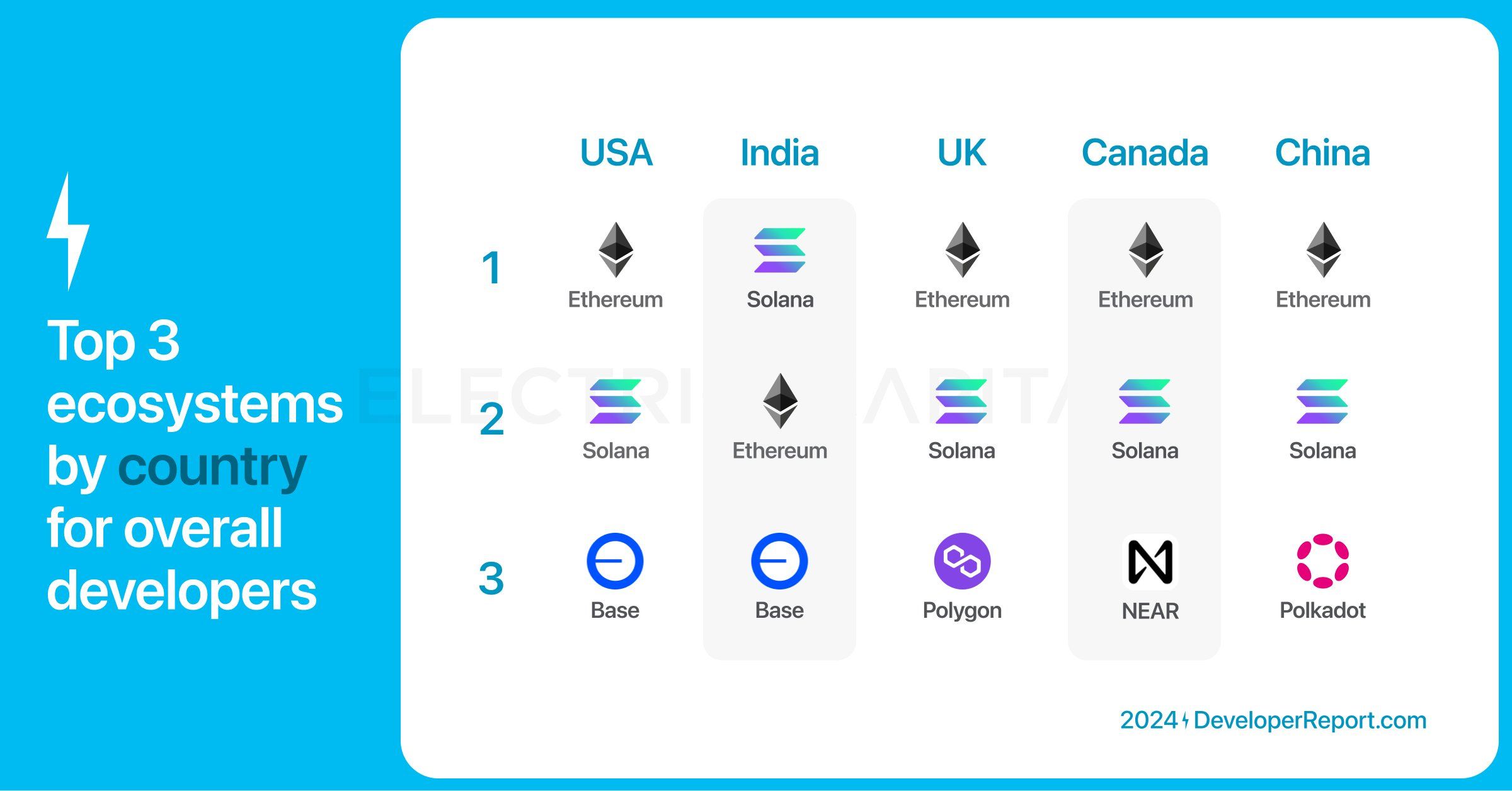 В 2024 году в такие блокчейны, как Dfinity, Aptos, Base, Биткоин, Sui, Near, Polkadot, Polygon и Starknet пришло по тысяче новых разработчиков. В Arbitrum, BNB Chain, Optimism, Stellar и TON прибыло более 500 блокчейн-специалистов.