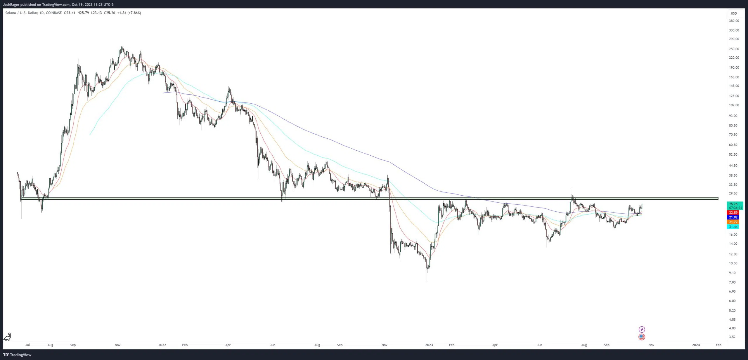 На данный момент Solana пытается закрепиться над линией шеи. Таким образом, дневное закрытие выше $26 подтвердит возможность дальнейшего роста.