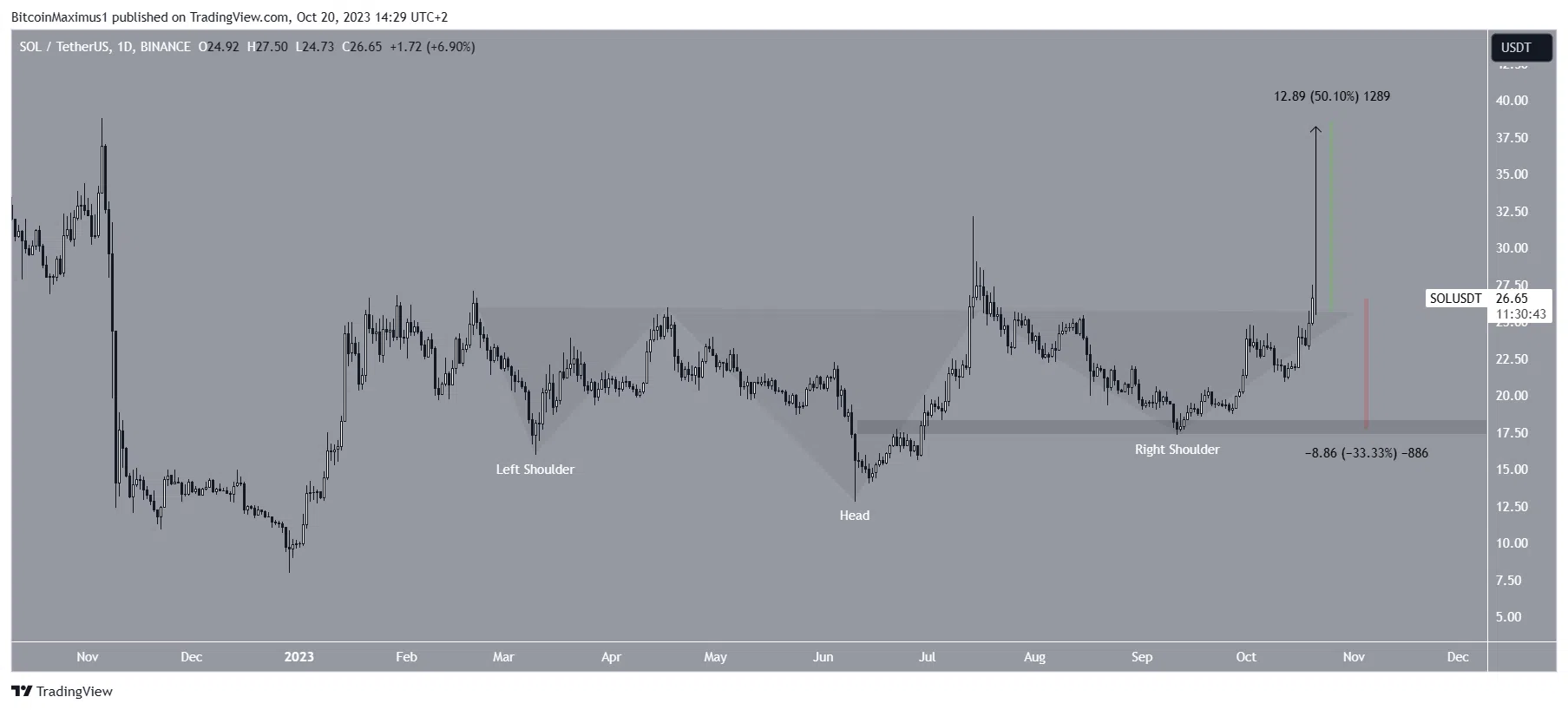 Несмотря на позитивный прогноз SOL, дневное закрытие ниже линии шеи сделает прорыв недействительным. В таком случае цена токена может просесть на 33% и достичь уровня поддержки правого плеча на отметке $18.