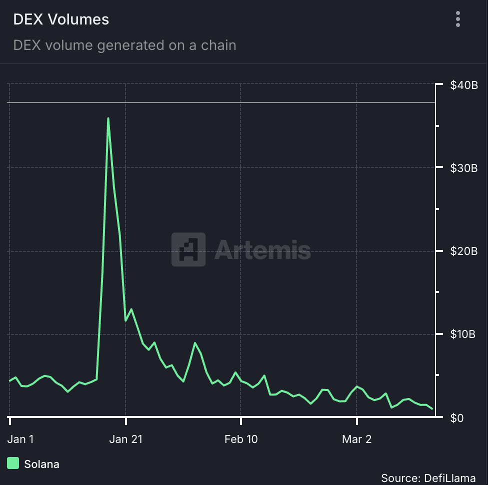 По данным Artemis, общий объем торгов на DEX на базе Solana вчера, 16 марта, достиг нового минимума с начала года. Торговый объем последовательно уменьшается еще с десятого января.