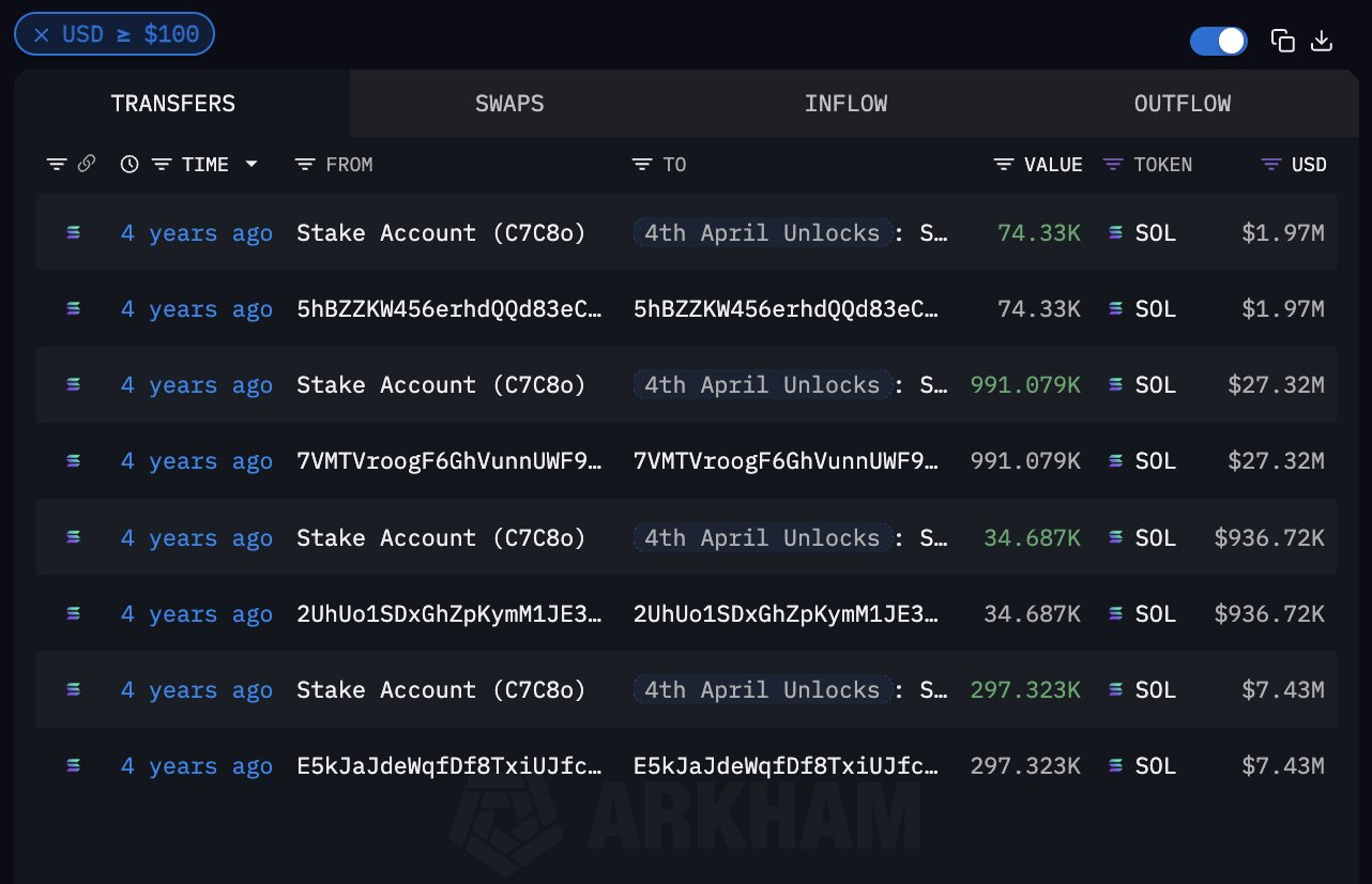 4 апреля 2025 — день крупнейшего разлока токенов Solana (SOL) из стейкинга. В Arkham обратили внимание на то, что следующий разлок подобного масштаба случится только в 2028 году