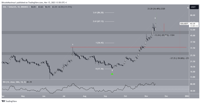 Согласно волновой теории Эллиотта, цена Solana находится в третьей волне пятиволновой бычьей структуры. Эта волна обычно является самой резкой и длинной. Ее длина приближается к значению, в 2,61 раза превышающему длину первой волны, что является потенциальной целью для формирования вершины.