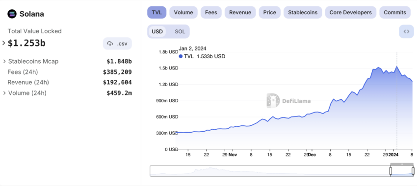 Высокая скорость транзакций на блокчейне Solana, низкие комиссии и запуск множества монет-мемов подогрели интерес к сети, в результате чего цены на SOL выросли почти до $127 с $38 в начале ноября. Стоимость активов, заблокированных в приложениях Solana (TVL), также значительно выросла, достигнув $1,53 млрд по сравнению с $400 млн в ноябре.
