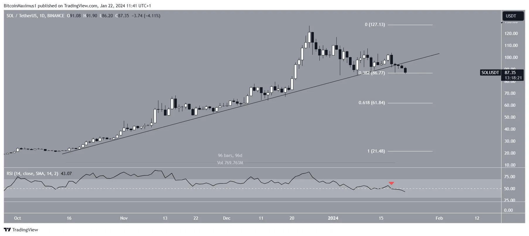 Цена Solana (SOL) упала ниже восходящей линии тренда поддержки, которая продержалась почти 100 дней.