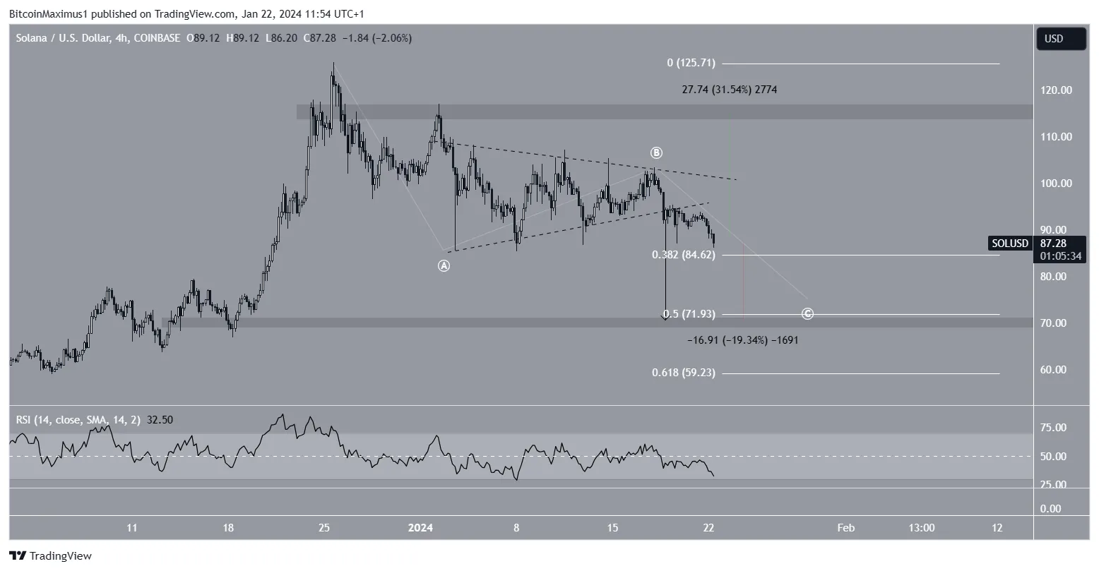 Ценовое действие показывает, что актив вышел из симметричного треугольника, подтверждая коррекцию. Кроме того, RSI находится ниже 50 и падает. Если коррекция продолжится, Solana может просесть еще на 20% до слияния поддержек в диапазоне $70-$72.