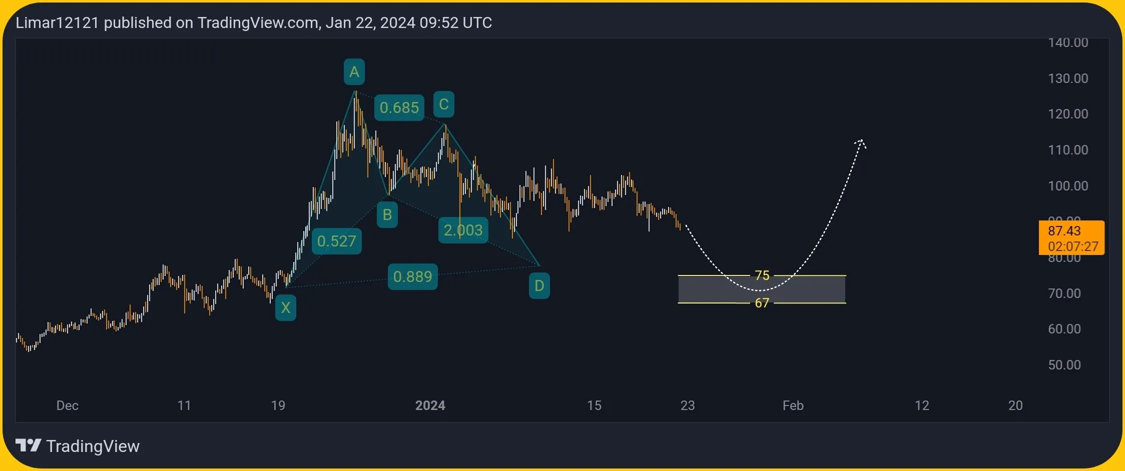 После этого цена актива начала падать. 19 января 2024 года она провалилась ниже восходящей линии поддержки и в настоящее время торгуется внутри области поддержки, которая совпадает с уровнем коррекции Фибоначчи 0,382.