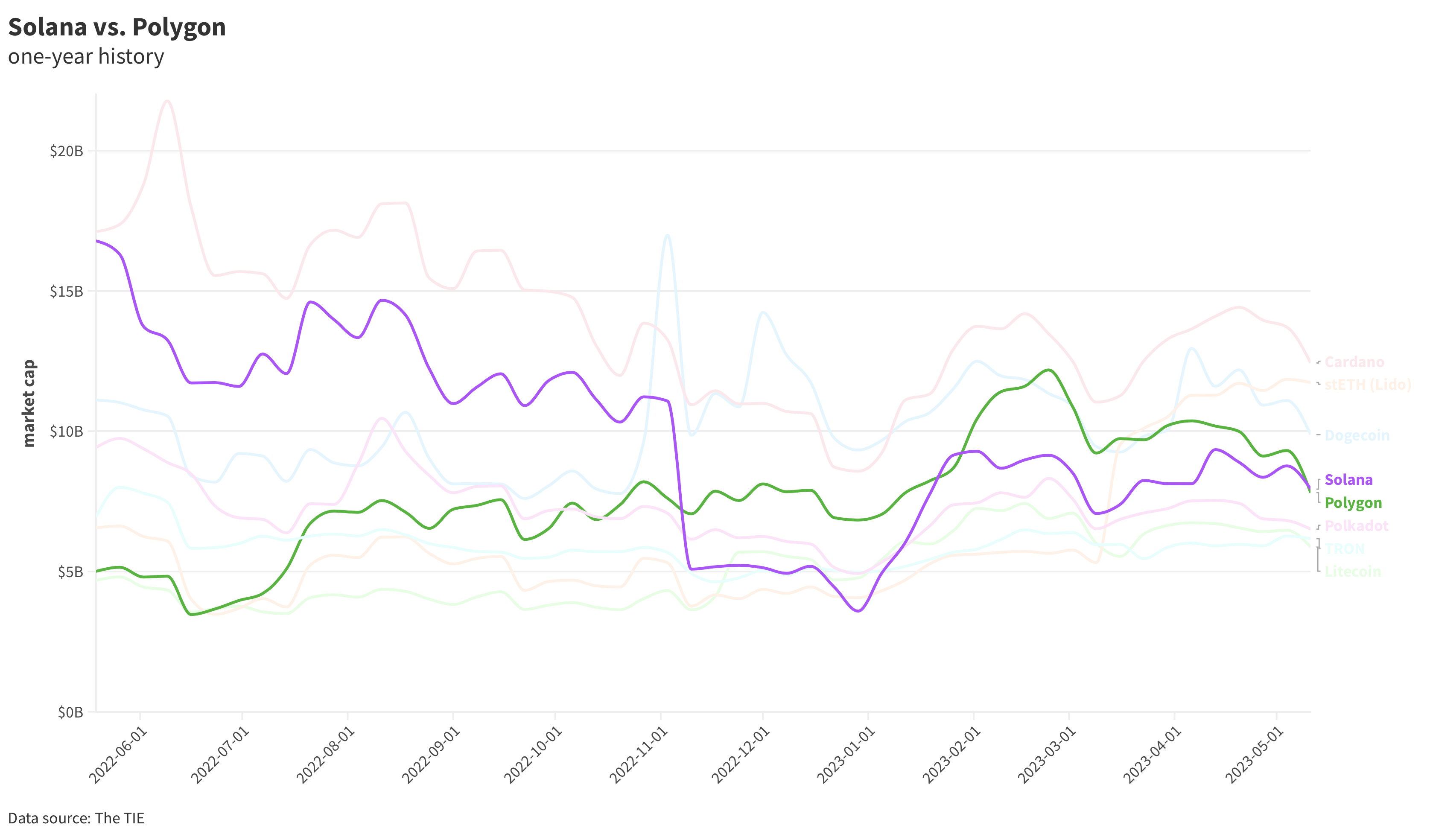 До коллапса экосистемы Terra, который произошел в мае 2022 года, капитализация SOL была в три раза выше, чем у MATIC — $16,8 млрд против $5 млрд. Однако падение FTX сокрушило токен. Основатель печально известной криптобиржи Сэм Бэнкман-Фрид был одним из самых известных сторонников протокола, и его венчурные доллары широко распространились по экосистеме Solana. Поэтому в течение нескольких недель после ноябрьского кризиса цена актива рухнула на 70%.