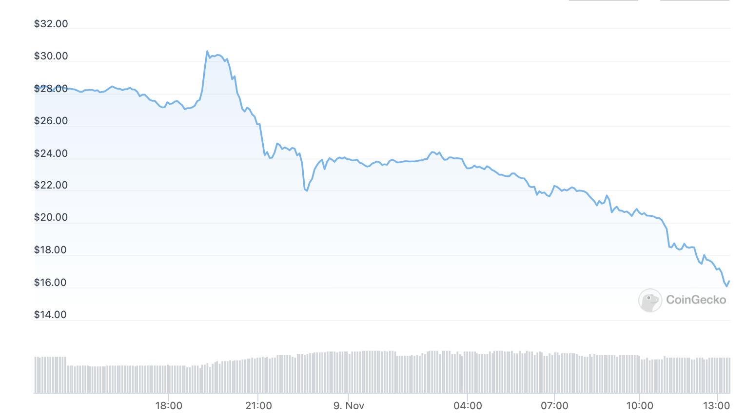 По данным CoinGecko, SOL тестировал отметку $15, при этом еще вчера вечером назад токен стоил более $30. Относительно исторических максимумов, зафиксированных почти ровно год назад, 6 ноября 2021 года на уровне $293, SOL подешевел на 93%. На момент публикации SOL восстановился до $17,8.