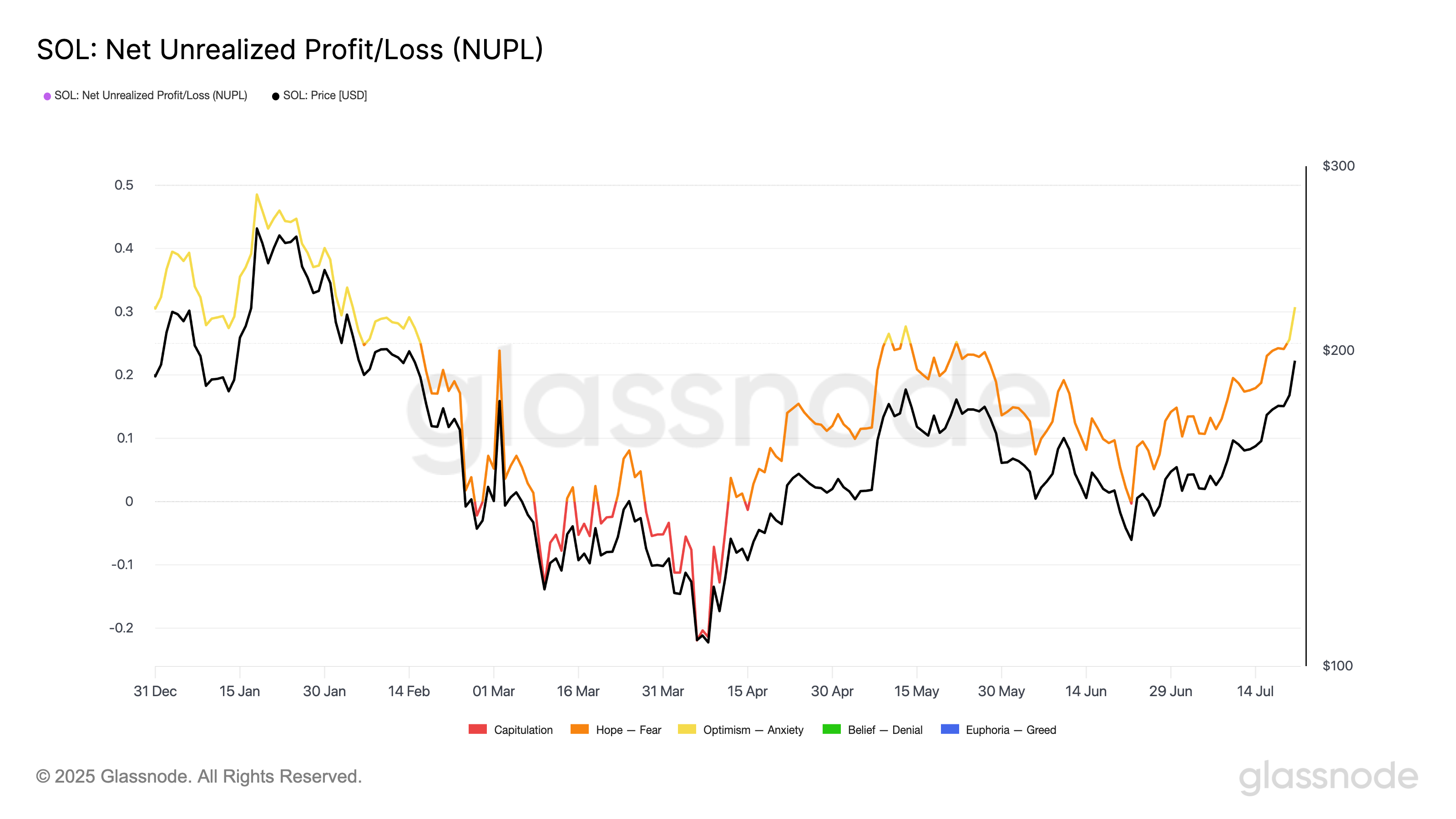 SOL показала двузначный рост за последнюю неделю и сейчас торгуется в районе $198,43, приближаясь к важному уровню $206, который последний раз фиксировался в феврале. Однако, согласно данным Glassnode, метрика Net Unrealized Profit/Loss (NUPL) для SOL указывает на состояние «Оптимизм–Тревога».