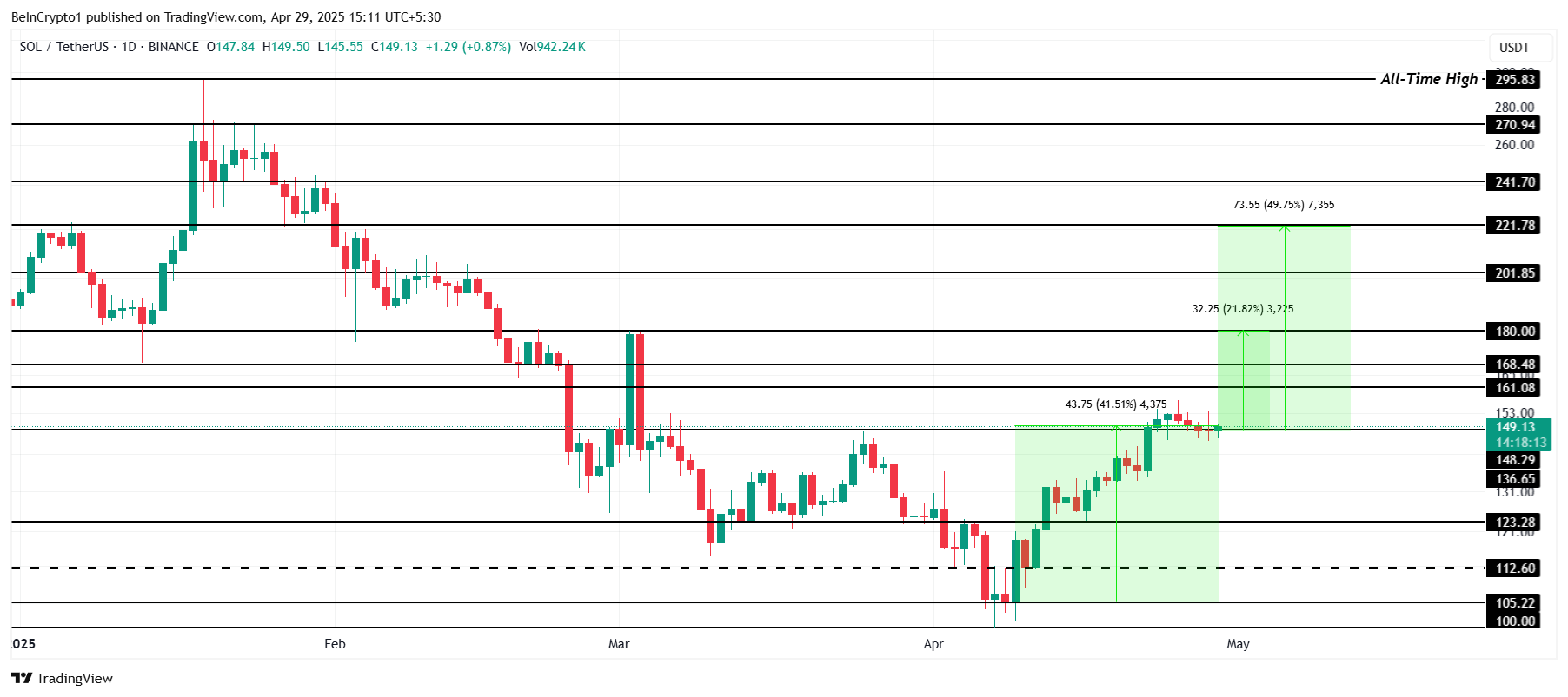 Цена Solana увеличилась на 41% в этом месяце, достигнув $149 на момент написания. Следующее значительное сопротивление находится на уровне $180. Его преодоление станет важным шагом к восстановлению после мартовских потерь. Для достижения $180 SOL необходимо подняться на 21,8%, что кажется вполне возможным с учетом текущего импульса.