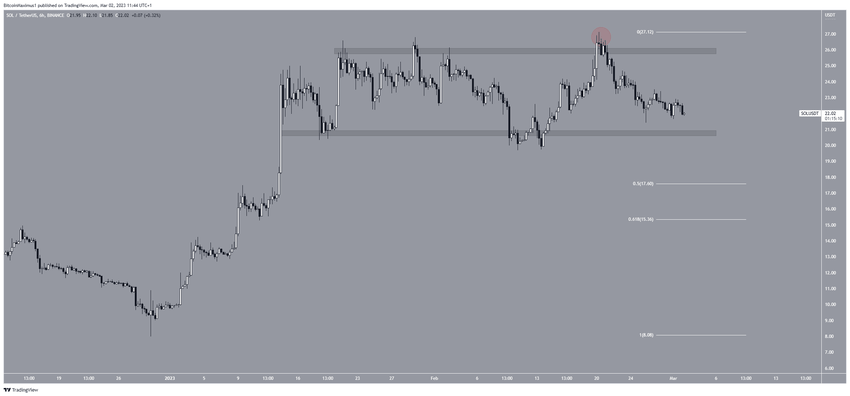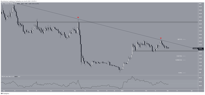 Результаты технического анализа показывают, что курс Solana с августа 2022 года снижался вдоль линии нисходящего сопротивления. В последний раз цена отскочила от этой линии 20 февраля (красный значок). После этого токен снижался и сейчас приближается области горизонтальной поддержки $20, которая присутствует на графике с 14 января.