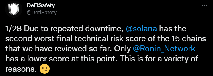 Сеть Solana оказалась на втором месте в списке худших проектов с технической точки зрения по мнению ресурса DeFiSafety