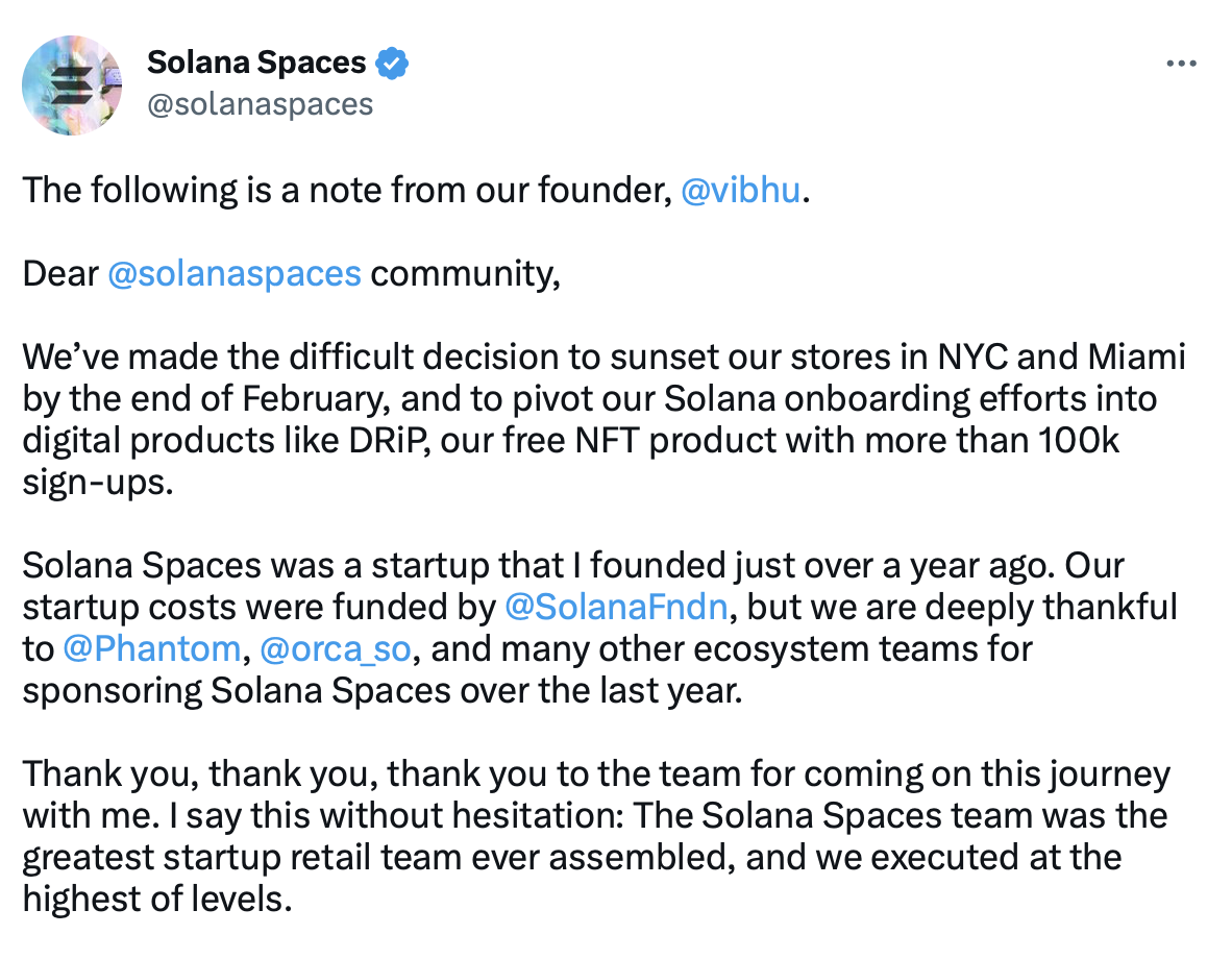 Новость появилась в «Твиттере» Solana Spaces. По словам основателя проекта Вибху Норби, команда перенаправит усилия на развитие NFT-платформы DRiP.