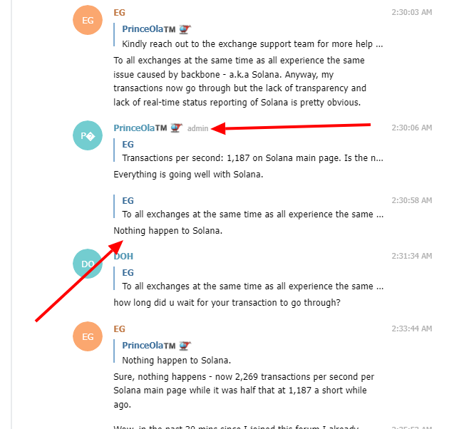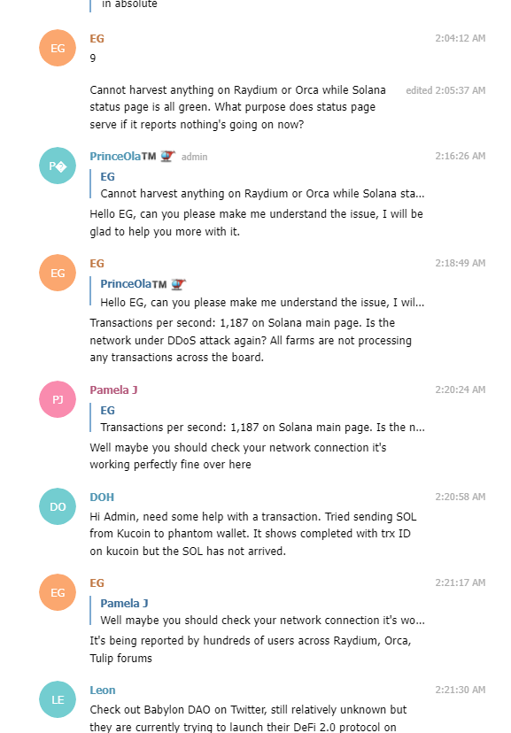 Позже недовольства техническими неполадками стали появляться и в официальной группе Solana в Телеграме. Пользователи заметили, что, несмотря на явные проблемы, веб-страница с показателями Solana отчитывалась о стабильной работе сети.