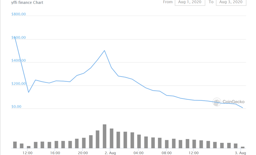 Еще один токен, YFFI, рухнул от своего исторического максимума на 99%, согласно данным Coingecko.