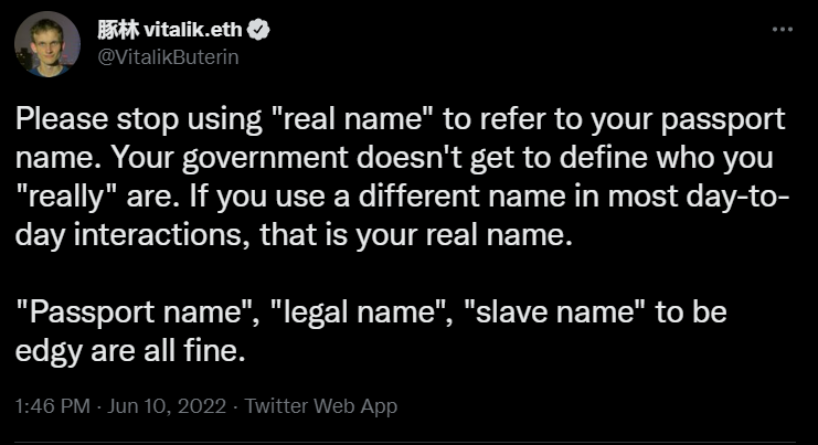 Бутерин отметил, что люди должны перестать прикрываться «настоящими именами», прописанными в паспорте, если они активно используют другие позывные или никнеймы на ежедневной основе.
