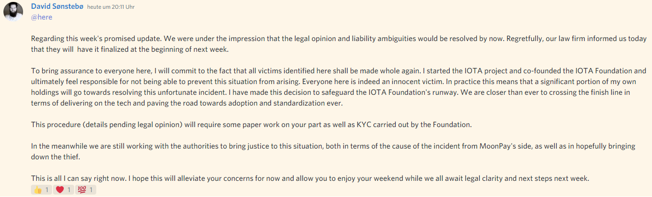 В частности, в нем говорится, что Сонстебо чувствует свою личную ответственность за ошибки в работе кошелька Trinity, поэтому готов направить собственные средства на покрытие убытков, не привлекая деньги из фонда IOTA. Кроме того, представитель компании рассказал, что сейчас продолжаются технические доработки, которые позволят в дальнейшем избежать подобных инцидентов.