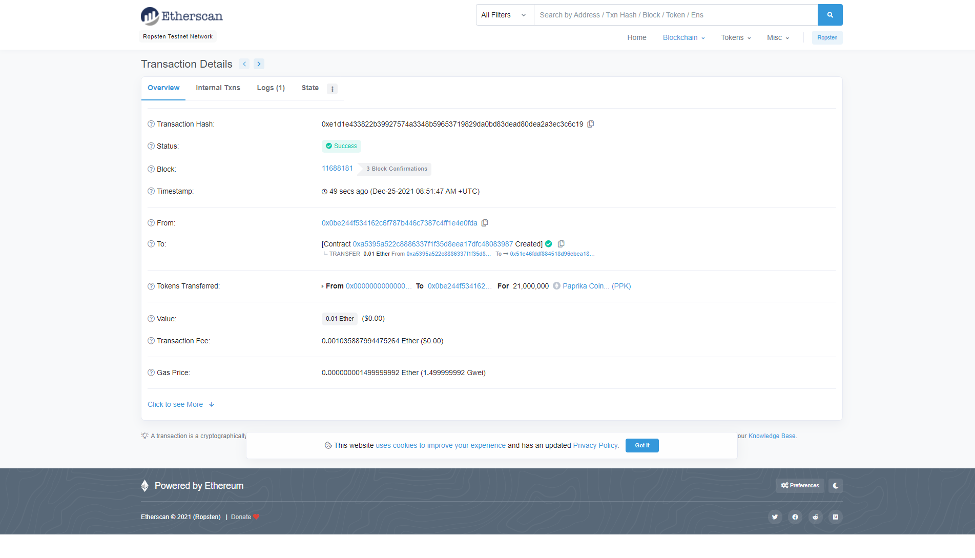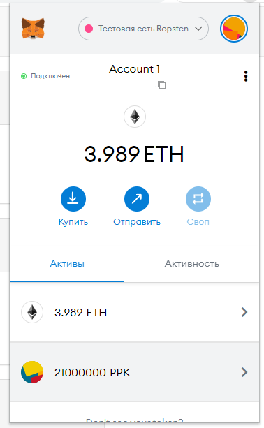 Нажимаем «Подтвердить». После этого с тестового баланса спишется ETH, но новые токены нигде так и не появятся. Это нормально. Ваш кошелек, скорее всего, пока не поддерживает смарт-контракт с новыми токенами.