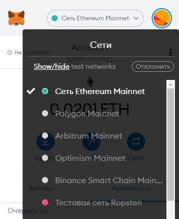Для подключения к тестовой сети открываем MetaMask > нажимаем сверху на кнопку «Сеть Ethereum Mainnet» > в выпадающем списке нажимаем на «Тестовая сеть Ropsten».