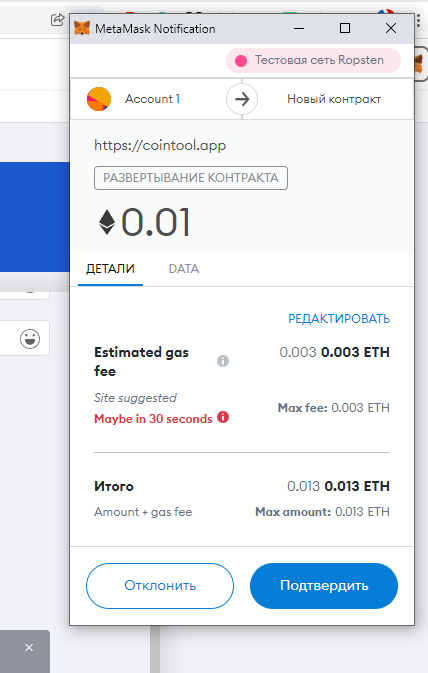 Как только вы выставили все необходимые настройки > пролистываем вниз и жмем кнопку «Create Token». Откроется окно с кошельком и запросом на отправку ETH для создания контракта с вашим токеном. В нашем случае на это потребовалось 0.01 тестовых ETH.