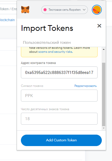 Кошелек должен автоматически подхватить данные импортируемого смарт-контракта, включая тикер токена и систему исчислений. Нажимаем «Add Custom Token».