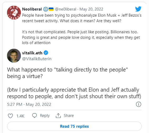 Виталик Бутерин все еще активен в социальных сетях, и недавно он ответил на твит Neoliberal, где тот рассуждает о том, почему не нужно искать смысл в постах миллиардеров, которые они выкладывают в твиттере (упоминались Илон и Джефф, они больше всех общаются со своими подписчиками). На это Бутерин заявил:
