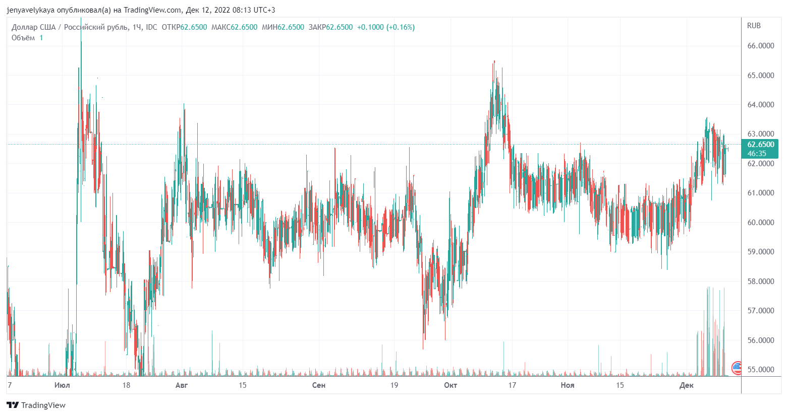 Рубль упал, когда страны утвердили потолок цен на нефть. В моменте после продолжительного боковика российская валюта опустилась до $63,5. После рубль скорректировался в район $62,5.