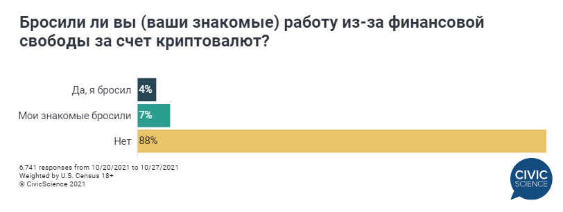 SponsoredВ опросе приняло участие более 6740 граждан США старше 18 лет. Согласно результатам, 7% респондентов (~472 человека) заявили, что их знакомые бросили работу благодаря криптовалютам. Фактически же бросили работу, разбогатев на криптовалюте лишь ~270 респондентов (4%).