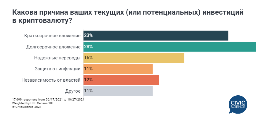 На вопрос о причине инвестиций в криптовалюту ответили почти 17700 человек. Из них 28% заявили, что пришли на рынок ради долгосрочной прибыли. Около 23% заинтересованы в быстрой окупаемости инвестиций. Еще 11% рассматривают криптовалюту как защиту от инфляции, и 12% — как способ не зависеть от правительства.