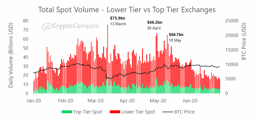 Согласно новому отчету аналитической платформы CryptoCompare более мелкие биржи, которые столкнулись с падением торговых оборотов на 53% в месячном выражении, ощутили на себе больший негатив, чем их крупные конкуренты.