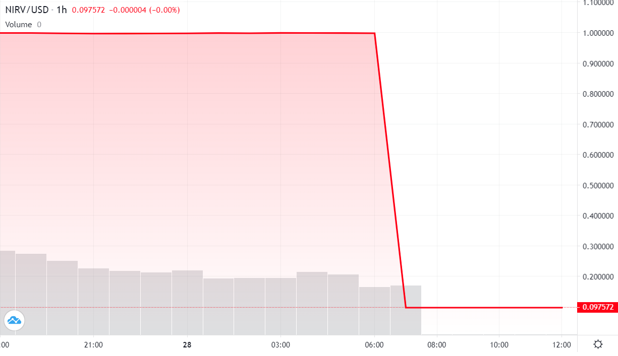 Алгоритмический стейблкоин nirvana (NIRV) потерял привязку к доллару США. На момент написания материала котировки NIRV/USD составляют $0,097. Вместе с NIRV обвалился в цене и токен nirvana ana (ANA) с $8,7 до $1,7.