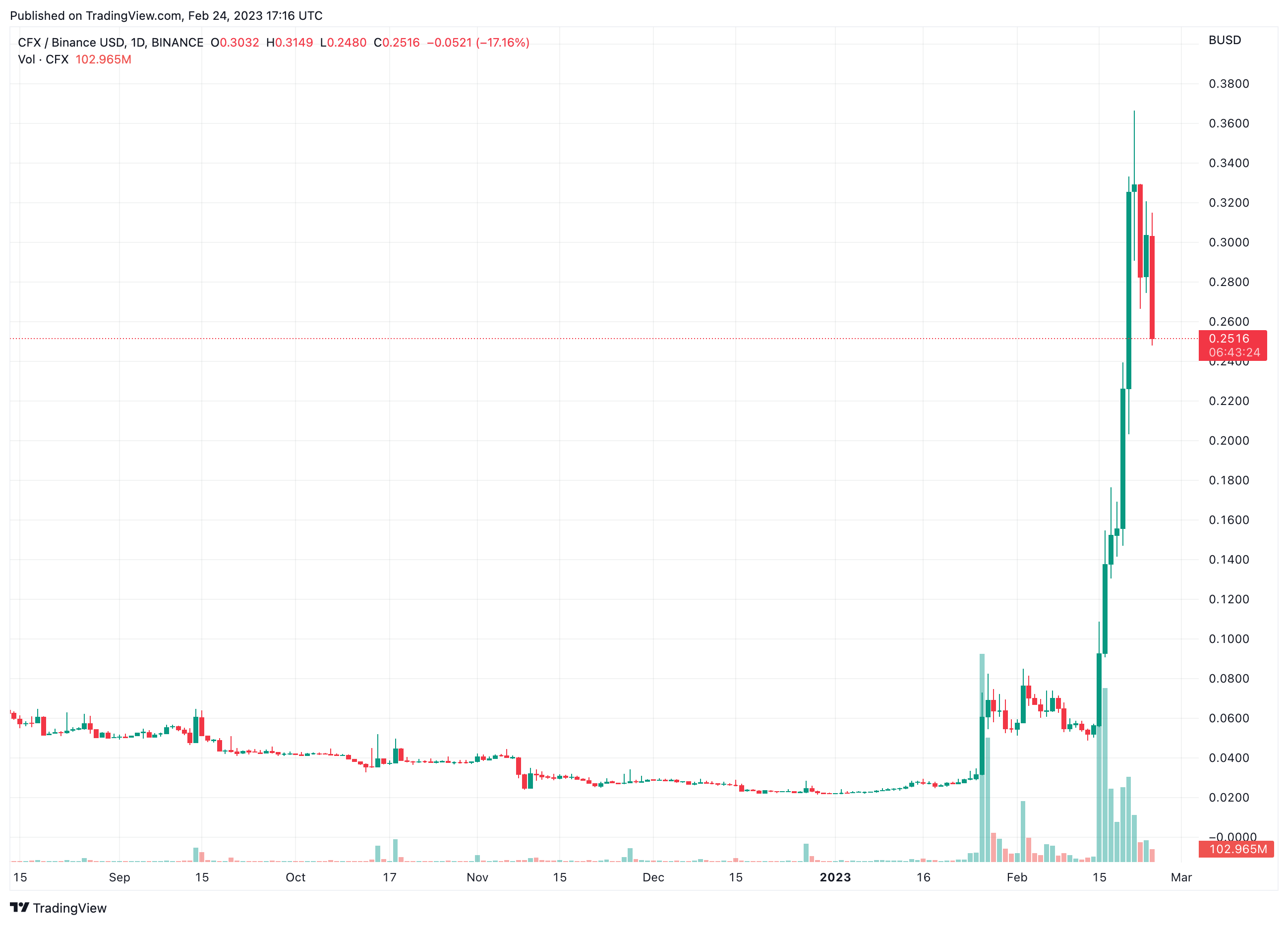 Впрочем, закрытие ниже CFX $0,20 станет сигналом о том, что прорыв был ложным. В этом случае токен может упасть $0,05. Текущий курс — $0,26
