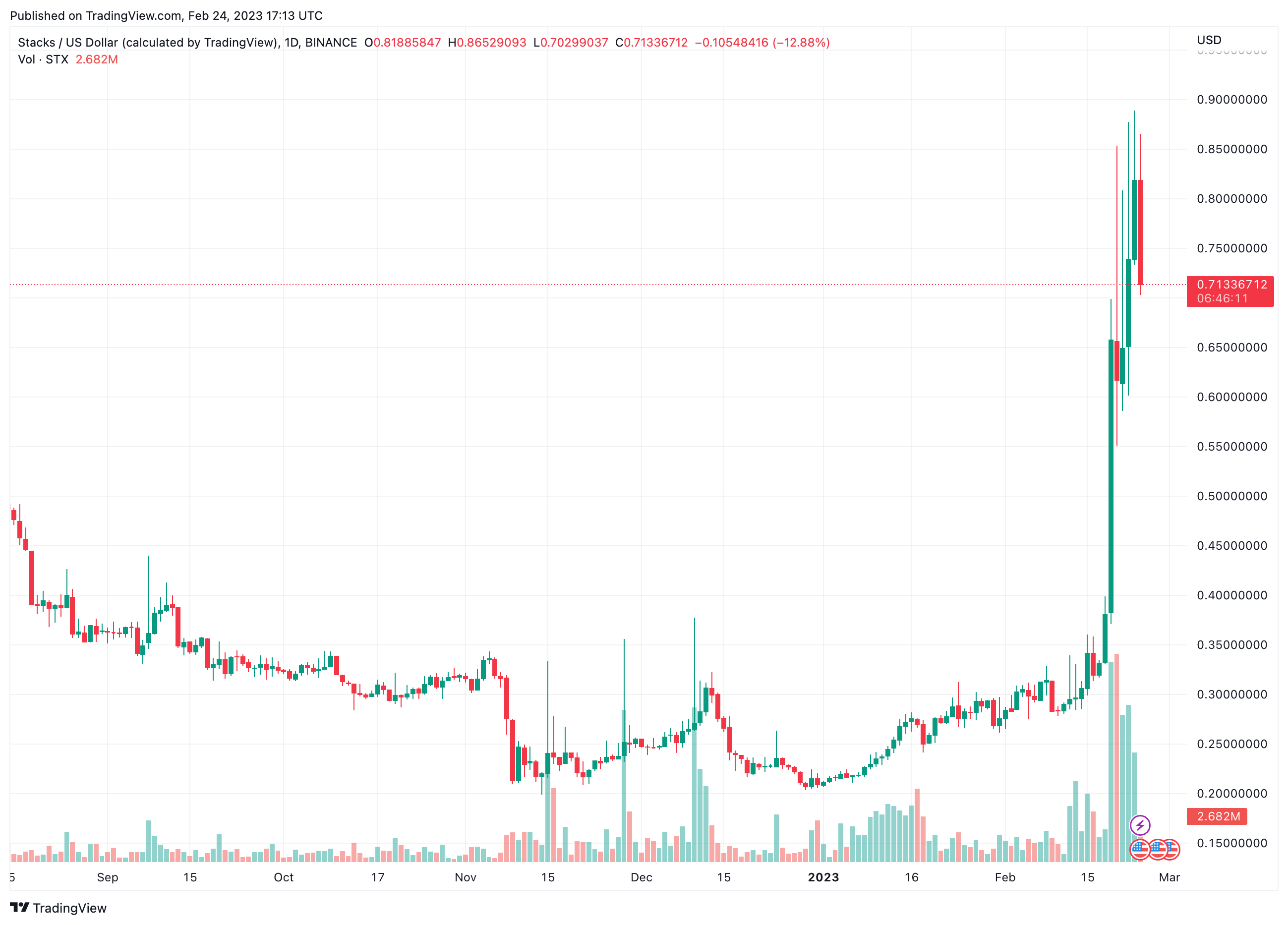 Как показывают результаты технического анализа, токен STX стремительно рос с 18 февраля. За пять дней размер ралли на пике составил 150%. Цена растет по параболе.
