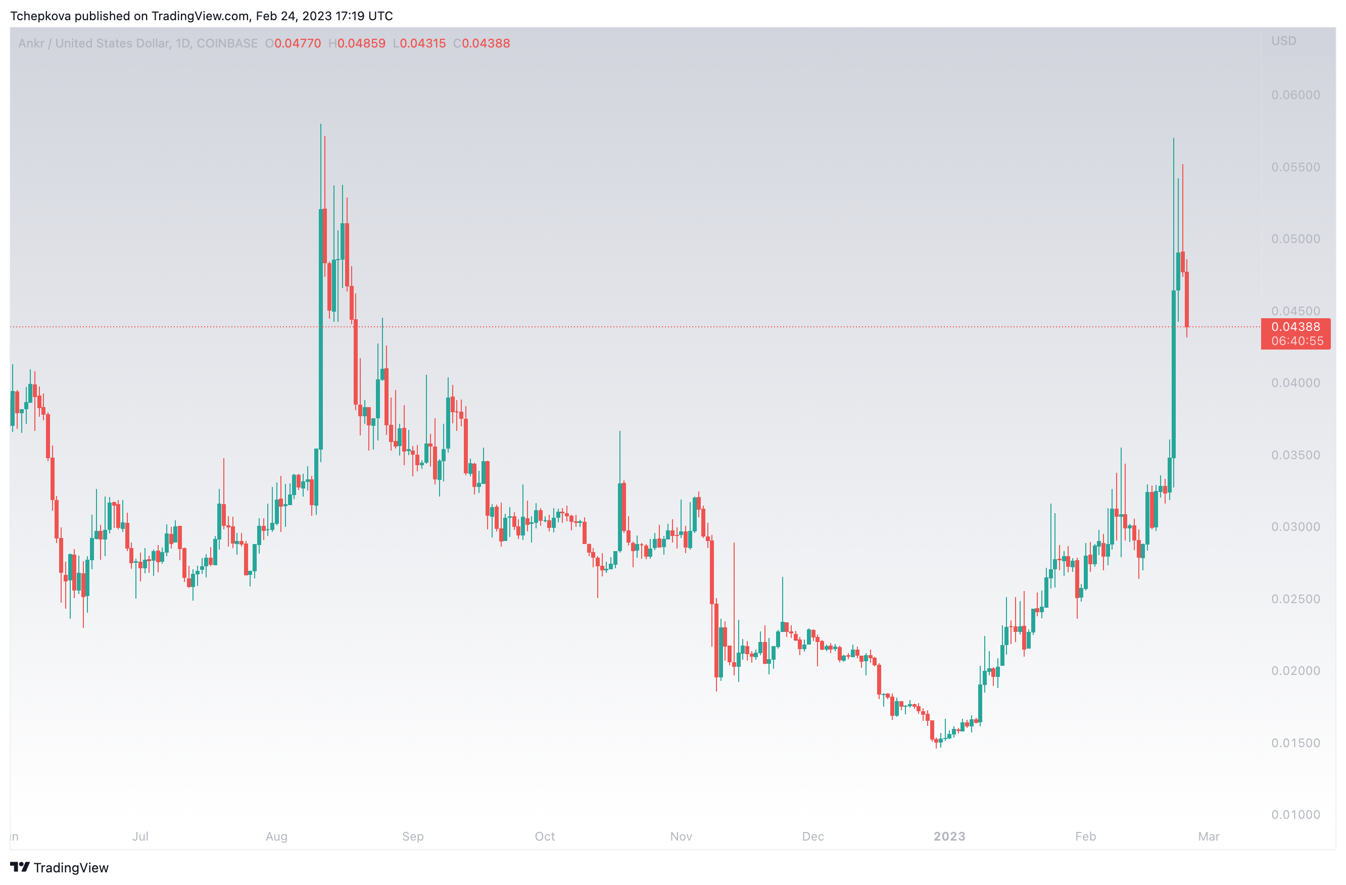 Курс ANKR энергично растет с начала года. 21 февраля темпы роста ускорились, подбросив рынок к максимуму на $0,057. Впрочем, на графике сформировался длинный верхний фитиль, и после этого цена снизилась.
