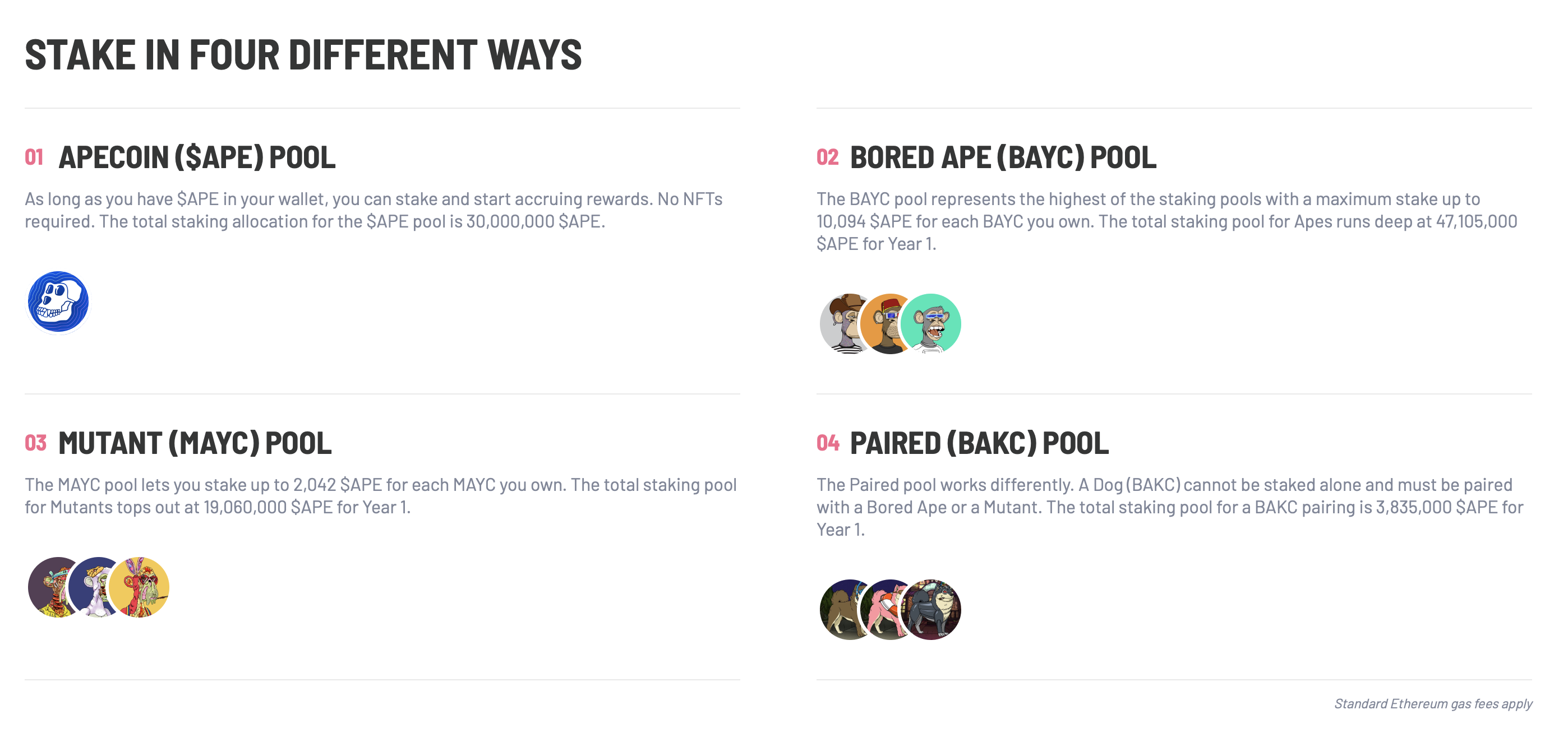 Пул Bored Ape предназначен для держателей NFT Bored Ape Yacht Club (BAYC). За каждый BAYC в стейкинг будет добавлено 10 094 APE. Пул Mutant Ape Yacht Club (MAYC) работает по такому же принципу: владельцы MAYC могут застейкать 2 042 APE за каждый NFT.