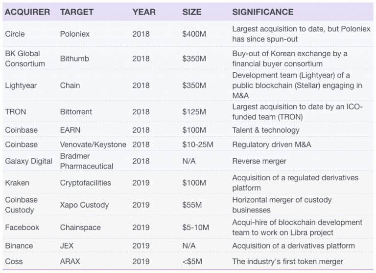 Несмотря на то, что крипторынок формируется, уже сегодня можно выделить несколько крупных сделок по слияниям и поглощениям в этом секторе. Так с 2013 года было совершено 350 сделок на общую сумму $4 млрд. При чем пик пришелся на 2018 год. За прошедшие 12 месяцев было заключено 162 сделки на сумму $2,48 млрд. В 2019 году наблюдается определенный спад активности. В текущем году было проведено всего 92 сделки на общую сумму $692 млн. Об этом говорится в итогом отчете TokenData.