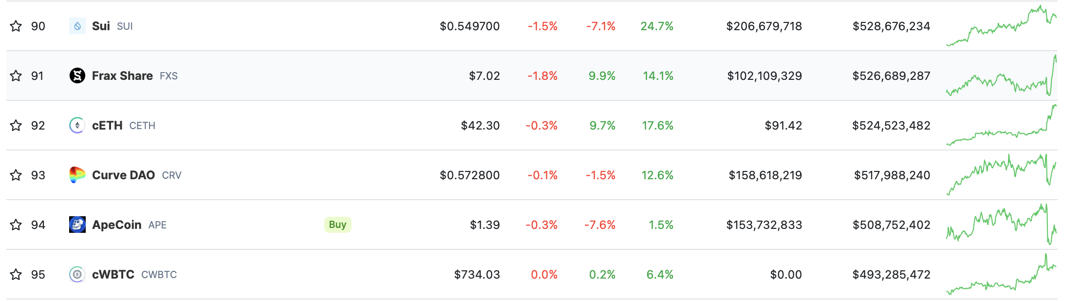 ApeCoin – нативный токен экосистемы Ape компании Yuga Labs, в которую входит одна из самых популярных NFT-коллекций Bored Ape Yacht Club (BAYC). На данный момент APE торгуется на 94,78% ниже исторического максимума, достигнутого в апреле 2022 года.