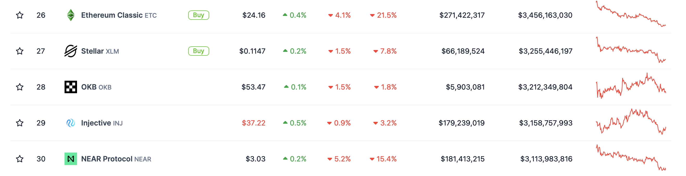 ETC — нативный токен блокчейна Ethereum Classic, продукта спорного хардфорка Ethereum, проведенного после взлома The DAO. Несмотря на впечатляющий рост крипторынка в последние месяцы, он все еще торгуется на 85,6% ниже исторического максимума, достигнутого в мае 2021 года.