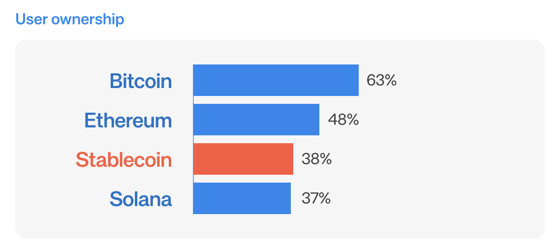 Долгое время криптовалюту считали спекулятивным инструментом или «игрушкой для техноэнтузиастов», но рынок меняется. Последние данные показывают, что кошельков со стейблкоинами теперь больше, чем кошельков с токенами Solana (SOL): на стабильные монеты приходится 38% всех кошельков, а на SOL — 37%.