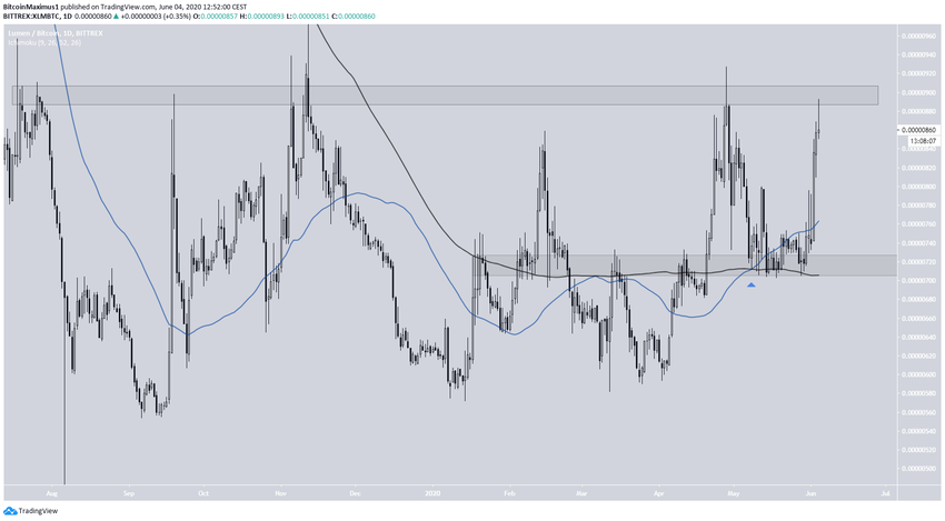 Сопротивление, о котором говорит Posty, располагается в районе 920 сатоши. В последний раз цена отскочила от него 28 апреля. Впрочем, после снижения курс XLM нащупал в начале июня поддержку над уровнем 720 сатоши и с тех пор начал активно укрепляться.