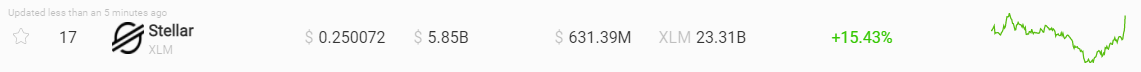 На фоне слухов о возможной сделке цена Stellar Lumens (XLM) подскочила на 15,4%. На момент написания материала цена альткоина в торговой паре XLM/USDT составляет $0,25.